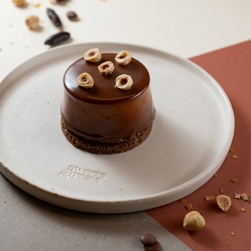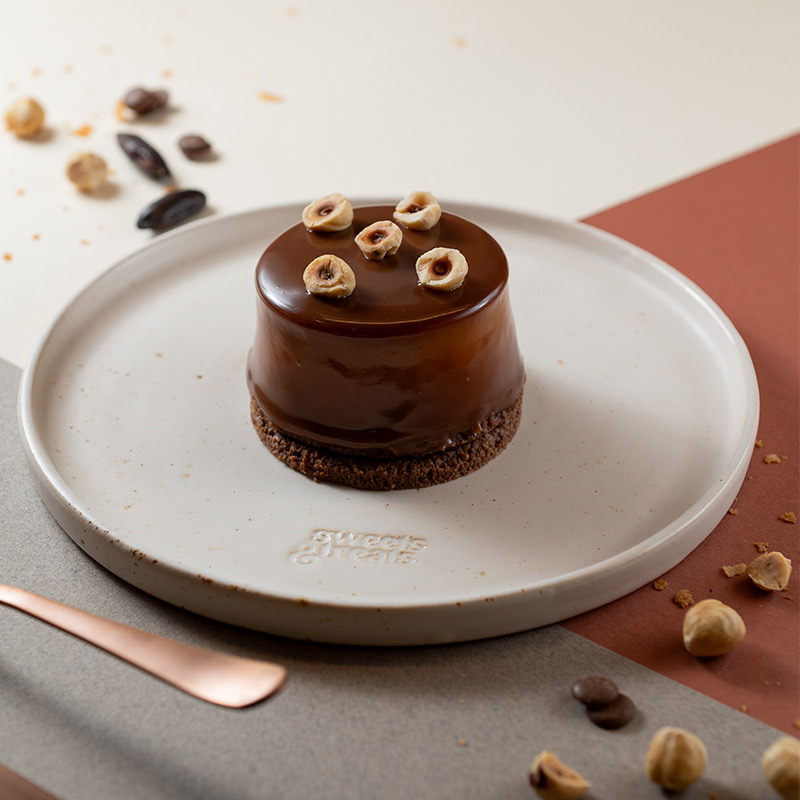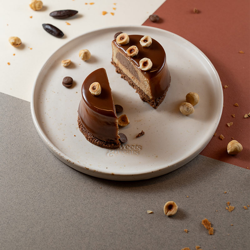 Τραγανή βάση φεγεντίνης με mousse πραλίνας φουντουκιού & καρδιά από σοκολάτα γάλακτος αρωματισμένη με tonka
